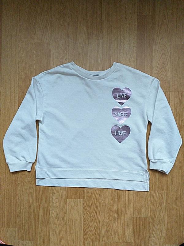 молочного цвета, с сердечками, с более длинной спинкой, плечи приспущены, в меру теплый. Размер 128 длина по спинке 46см, ширина 40см, плечи 44см, длина рукава 38см