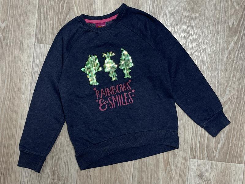 Свитшот тролли, тёмно-синий. Узор выполнен пайетками.Внутри на байке, манжеты не растянуты. 🔹6 лет Длина 46. ПОГ 35. Рукав от шеи 50