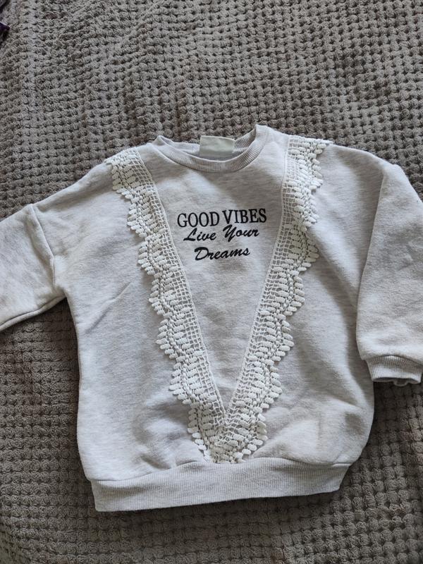 утепленный свитшот для девочки 3-4 года очень стильный, с кружевными нашивками состояние отличное замеры: длина 41 см рукава приспущенные, примерно от плеча 32 см ширина подмышками 40 см внизу ширина по резинке 29 см, тянется в стиле оверсайз