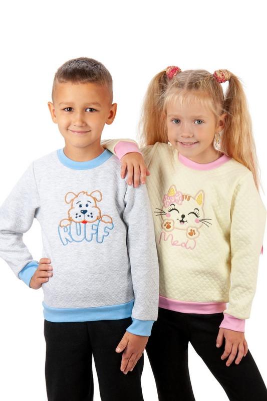 Свитшот для мальчиков и девочек изготовлен из полотна "Капитон". Данная модель выполнена с яркой и интересной вышивкой, которая обязательно понравится детворе. Такая вещь является универсальной, может комбинироваться с любыми брюками, джинсами - выглядит стильно и является обязательным атрибутом в гардеробе вне зависимости от возраста или пола. Полотно: капитон. Состав: 90% хлопок, 10% полиэстер. ,,3411