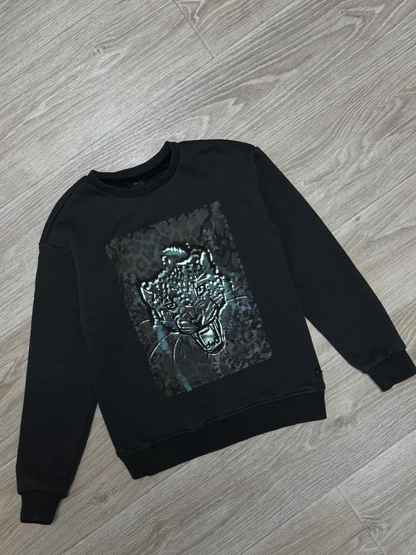 Свитшот с рисунком леопарда — отличный выбор для стильного и уютного образа. Темно-серый цвет придает нейтральность, а рисунок леопарда добавляет дерзкости и модного шарма. Мягкий материал и комфортный крой делают этот свитшот идеальным для повседневного использования. Добавьте нотку дикой элегантности в свой гардероб с этим стильным свитшотом. На байке 🏷️JM 9-10 лет/134-140 Длина 48. ПОГ 38. Рукав от шеи 56
