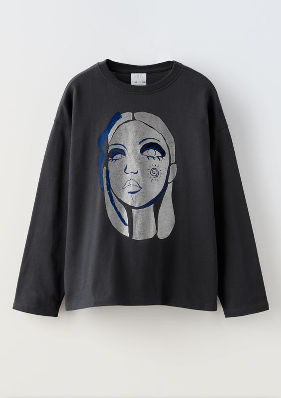 Якісний і стильний підлітковий реглан Zara. Вільний крій. Блискуча аплікація обличчя спереду. Колір - антрацит. Матеріал - 100% котон. Розмір 11-12 (152 см) - довжина від плеча 59 см, по грудях 48 см, рукав 50/46 см Розмір 13-14 (164 см) - довжина від плеча 64 см, по грудях 53 см, рукав 52/48 см