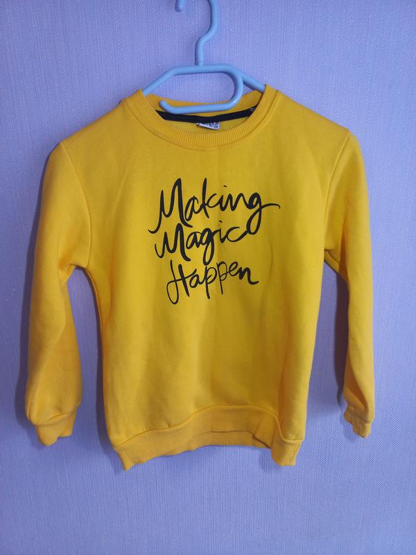 Утепленный свитшот желтого цвета с надписью, есть пятна от ручки. Длина - 51см, ширина - 40см, рукав - 44см.