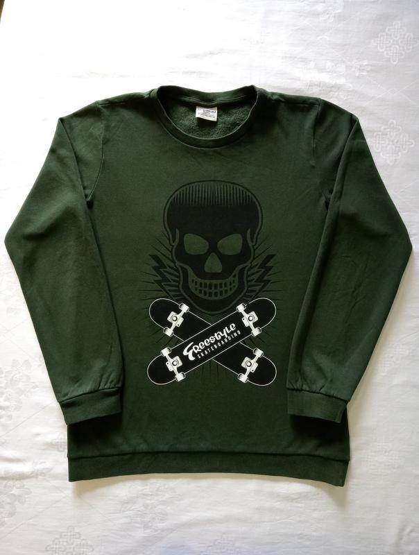 Світшот для підлітка з бавовняного трикотажу зеленого кольору з принтом череп і скейтборд Довжина 60 см НОГ 45 см Низ 42 см Ширина спини від плеча до плеча 38 см Довжина рукава 55 см Розмір на 10-11 років, 140-146 см Стан ідеальний З усіх питань звертайтеся
