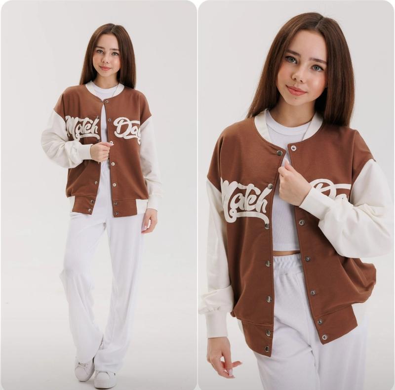 Бомбер Весна/Літо. Без флісу! Стильний бомбер для дівчаток Застібається на кнопки. Є кишені. Тканина - турецька двонитка піньє. Якість відмінна! РЕКОМЕНДУЮ! Розміри повномірні -оверсайз Заміри: 134 - довжина - 54см, ПОГ - 45см, рукав від горловини - 62см. Мс