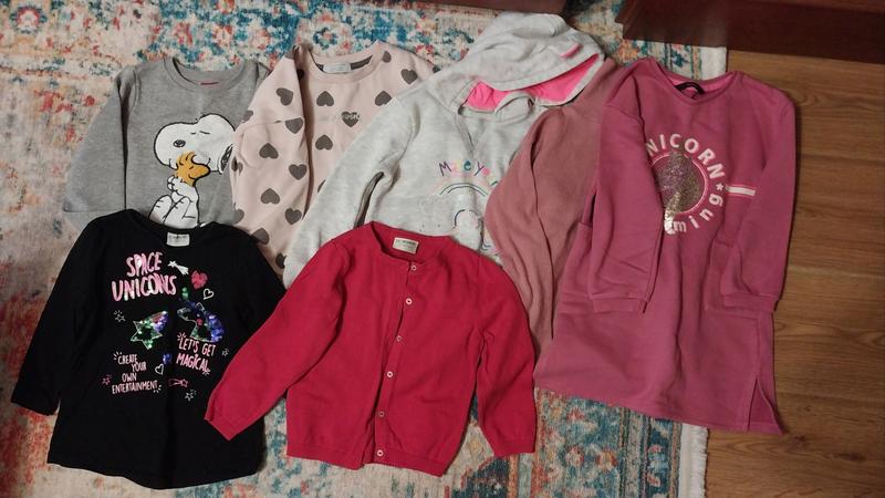 набор на 3-6 лет, смотрите фото, там размеры есть.primark, peanuts, lc waikiki, george и др. нюанс на кофтке с ушками - пятна от красок (последнее фото)