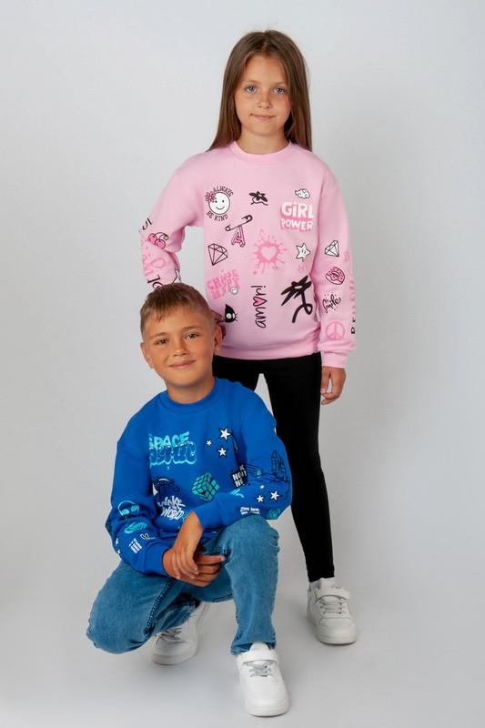 Крутезный детский свитшот выполнен из полотна "Футер с начесом". Стильная и актуальная модель свободного кроя, низ и рукава на эластичных манжетах, спереди и на рукавах украшена красивым рисунком. Такую вещь можно сочетать с брюками, джинсами и с любой обувью. Полотно: футер с начесом. Состав: 100% хлопок. Рекомендации по уходу: стирать при температуре не более 30°C. Рисунок гладить только по изнаночной стороне.