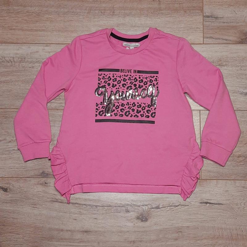 Розовый свитшот для девочки от PIAZAITALIA. Крутое качество. Спереди имеет надпись, выполненную пайетками. По бочкам разрезы, обшитые рюшами. Рукав на манжеті. Двухнитка.Размер 5-6 лет. Замеры: длина переда 45 см, длина по спинке 47 см, ширина 37 см, рукав 40 см.