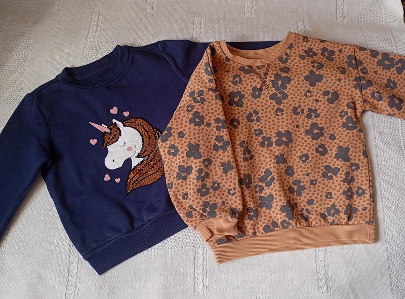 Набор из двух свитшотов, р.98, на небольшом флисе. Синий - sinsay, лео - f&f. Состояние близок к идеальному. Замеры: Синяя с единорогом длина - 36,5 рукав - 33 под ручками - 34 плечи - 26 Лео, будет оверзайз длина - 39 под ручками - 37 рукав приспущен, поэтому замеры от воротника - 37 плечи свободно