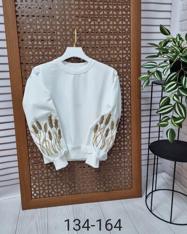 Стильный свитшот с вышивкой Ткань двухнитка пенье отличного качества Манжеты зерна Цвет молочный 🌷134(2 шт)-длина45,пог 43,рукав от горловины 58 🌷146(2 шт)-длина 48,пог 45,рукав от горловины 60 🌷152(1 шт)-длина50,пог 46,рукав от горловины 62 🌷158(2 шт)-длина 52,пог 48,рукав от горловины 64 🌷164(2 шт)-длина 54,пог 49,рукав от горловины 66 +-2 см