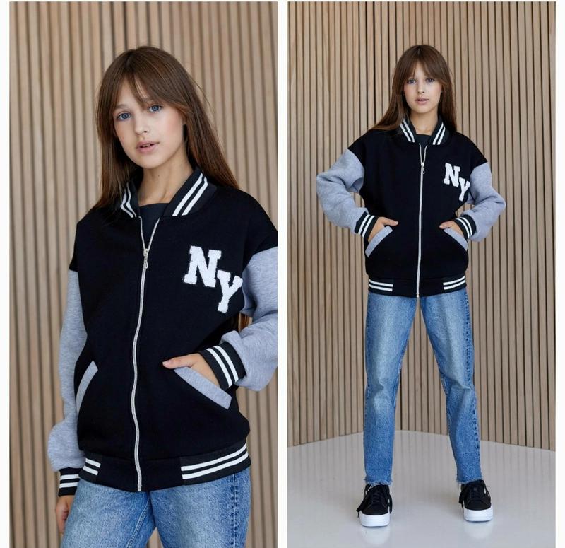 Стильный теплый бомбер Действующие карманы 👌🏻 Манжети-резинка По всей длине молния Буква - нашивка Ткань: ТУРАРОККА трехнитка на флисе (НЕ КОШЛАТЫТСЯ ЗАМЕРЫ-длина от плеча/рукав от горловины/пог 140- 56 / 61/49 Ток