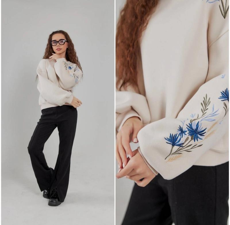 Свитшот с вышивкой василька (разнотравье,колоски) На рукаве свитшота выгибка, НЕ рисунок, манжеты меловая. Ткань - турецкая трехнить на байке. Качество отличное! Замеры: 140 длина - 44см, полуобхват груди - 52см, рукав от горловины - 60см. 146 длина - 45см, полуобхват груди - 53см, рукав от горловины - 61см. 152 длина - 49см, полуобхват груди - 55см, рукав от горловины - 65см. 158 длина - 53см, полуобхват груди - 56см, рукав от горловины - 67см. 164 длина - 57см, полуобхват груди - 59см, рукав от горловины - 72см. Мс