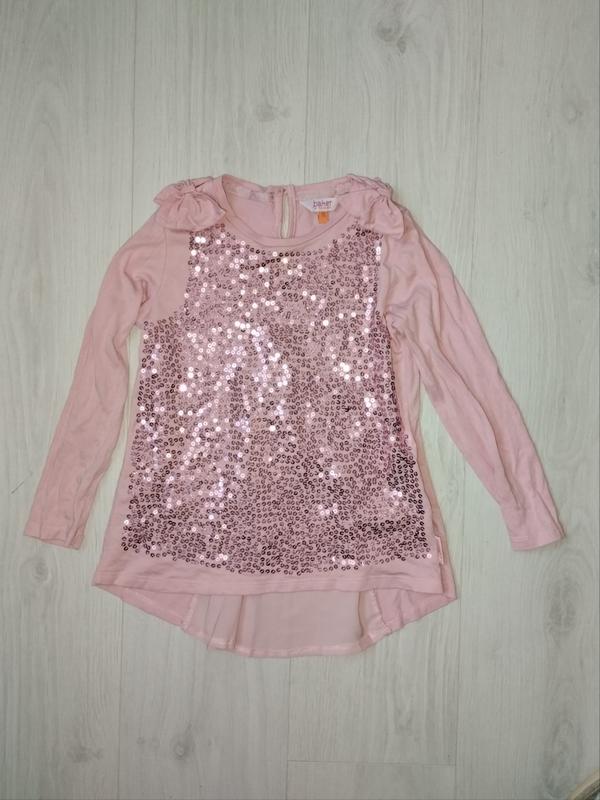 Нарядная кофточка, на пиях бантики, интересно оформленная спинка, по спинке длиннее. По бирке размер 7-8р. Замеры: пог - 34см, длж.от плеча - 46/52, рукав от плеча - 41см