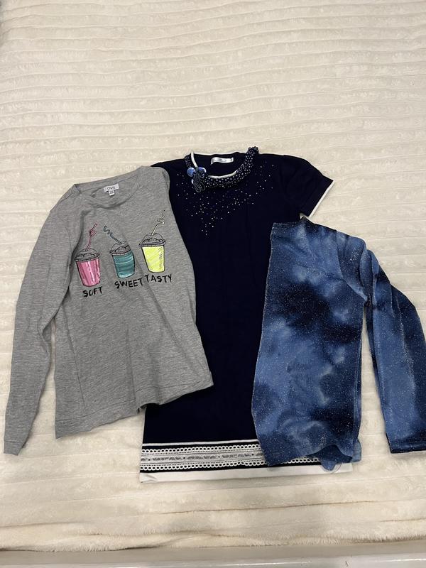 Темно-синее трикотажное платье. Наделось пару раз, в хорошем состоянии Серый лонгслив OVS, новый, не одевался. Тканина бавовна Синий блестящий лонгслив. Тканина тонка Цена за весь лот 3шт