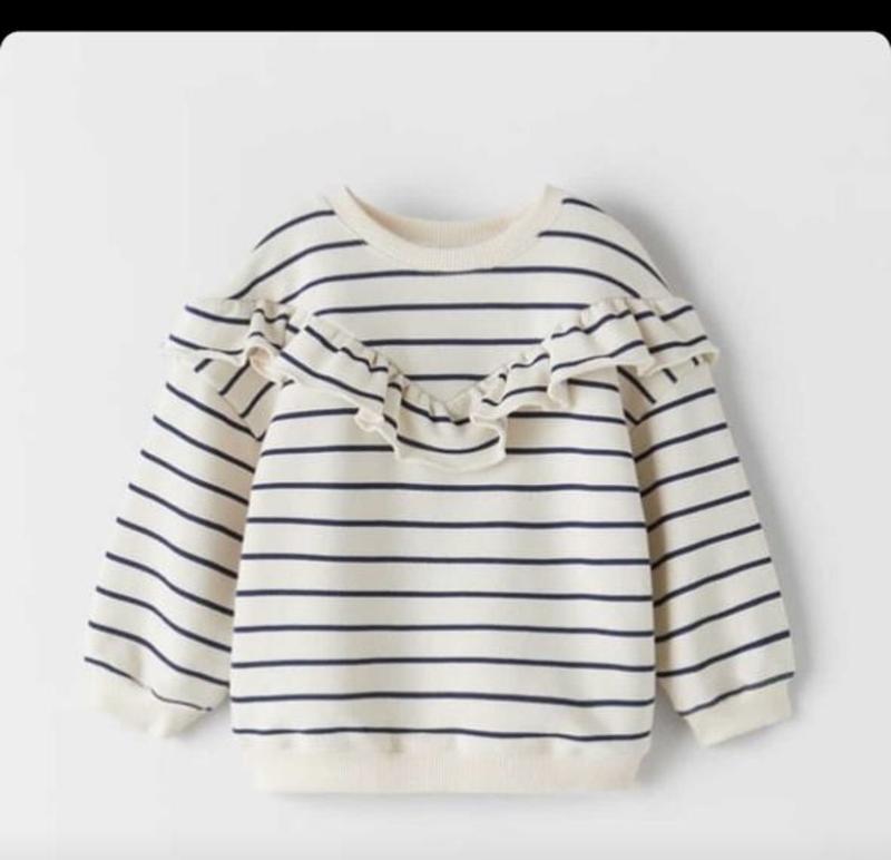 Стильний світшот від Zara більшомірить Розмір 110 (4-5) буде довше Стан на 4 є невеличка плямка, але відіпрати не пробувала(останне фото вказала) Не утеплений