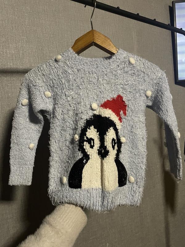 Красивый новогодний свитерик с пингвином.По наборке 5-6роков,110-116 см Замеры: длина-48см,рукав-36см,напов обхват-37см