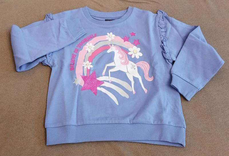 Совершенно новый свитшот очень хорошего качества, 100% коттон, рисунок с блестками, реально цвет темно сиреневый, не голубой. Зарекомендовало из Англии, указано размер 6-7 лет, но маломерит и лучше подойдет на 5-6. замеры: длина от шеи 42 см ширина по груди 38см длина рукава от плечевого шва 39см