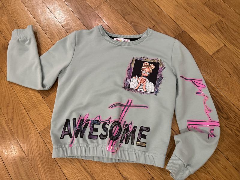 Свитшот, укороченный, манжет на резинке, красивый принт, цвет светло-зеленый, немного похожий на оливковый, подойдет на 6-8 лет, не больше. Замеры по запросу, пересасываю с Киева за счет покупателя. Смотрите все объёмы.