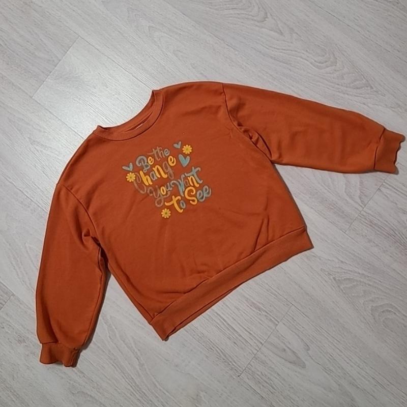 Свитшот для девочки 5/6 лет, рост 128134 см, замеры: плечи 48 см, рукав от плеча 41 см, пог 48 см, длинна 48 см.