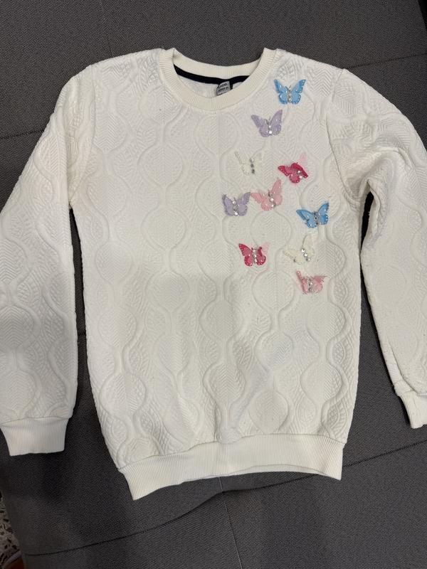 Білий світшот з нашитими метеликами. Заміри: Довжина 53, плечі 32, рукав 50, груди 38