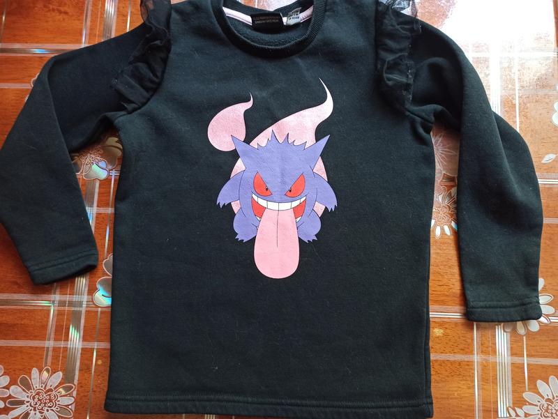 Стильный свитшот с монстриком. На плечах оборки из органзы. Внутри утеплённый. Круглая горловина.
