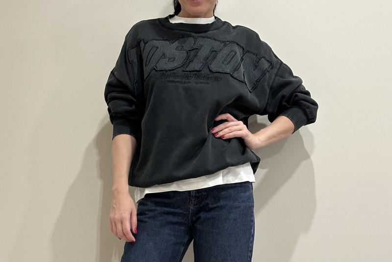 Світшот H&M із двохнитки з невеликим начісом. Розмір S, оверсайз. Підійде на М-Л. Тканина наче трохи виварена, темно-сірий відтінок. В ідеальному стані. Вдягався разів 5. Гарно виглядає з білою футболкою.