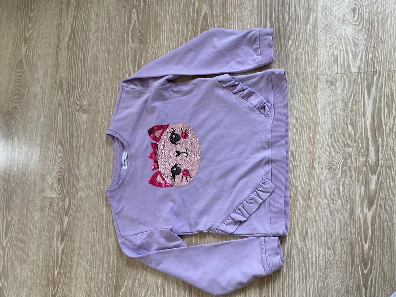 Світшот в гарному стані ніжно лавандового кольору, двонитка. Ширина 40 см, довжина 48 см, рукав 41 см. Всі паєтки на місці, котик двосторонній . Розмір 140, на 8-9 років