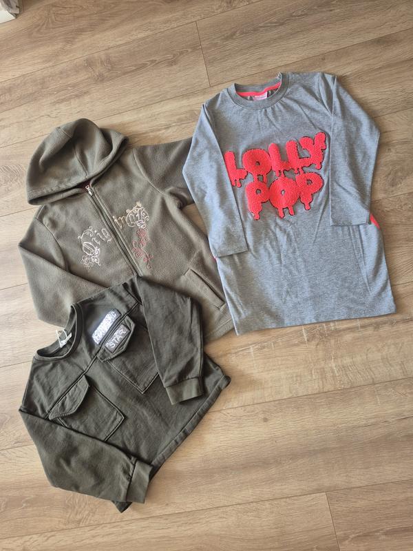 Набором флиска, туника и свитшот, в идеальном состоянии. Свитшот даже не носили. На рост 122-128см, на возраст 6-8 лет. Замеры туники длина от плеча 40см, ширина 33см, длина от плеча 60см. Длина флиски 53см, ширина 39см, длина рукава от плеча 43см.