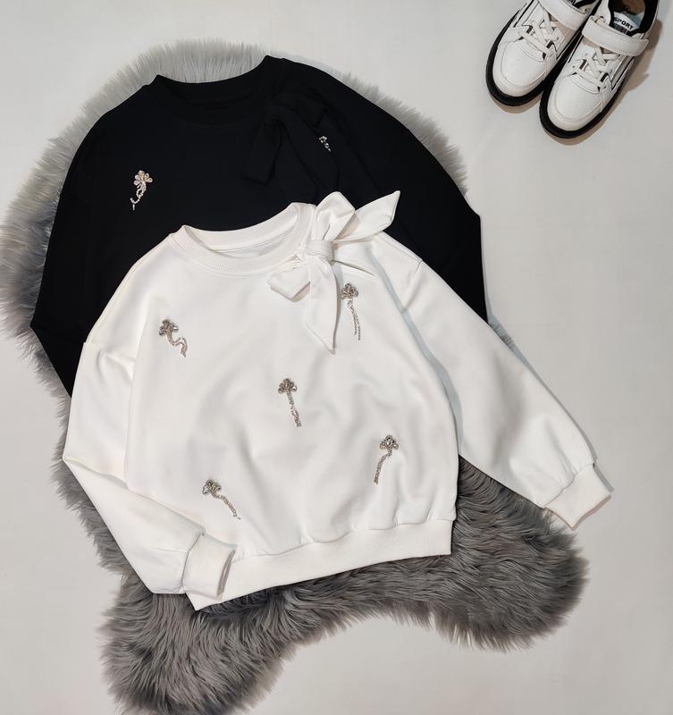 1050 грн Красивая и праздничная кофточка для девочки Качество супер Декорована прикрасами, бонтом Сбоку есть вырез Тканина двунитка Замеры_длина/пог/рукав от горловины 120_49/48/59 130_53/51/64 140_55/52/66 150_59/55/69 160_62/57/74 белая- 120-1шт 130-1шт 160-1шт чорна 130-1шт 140-1шт