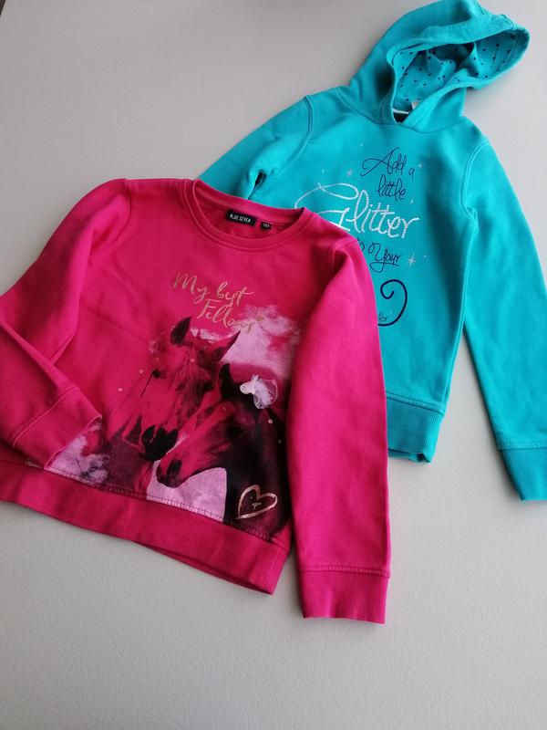 Продажа лотом, цена за все. Фирменные свитшоты с начесом р.116-122, на девочку 6-7 лет. В очень хорошем состоянии, без дефектов. Бирюзовый Tom Tailor, длина 47, ширина 30, рукав от плеча 47. Малиновый Blue Seven, длина 42,ширина 37,рукав от плеча 42.