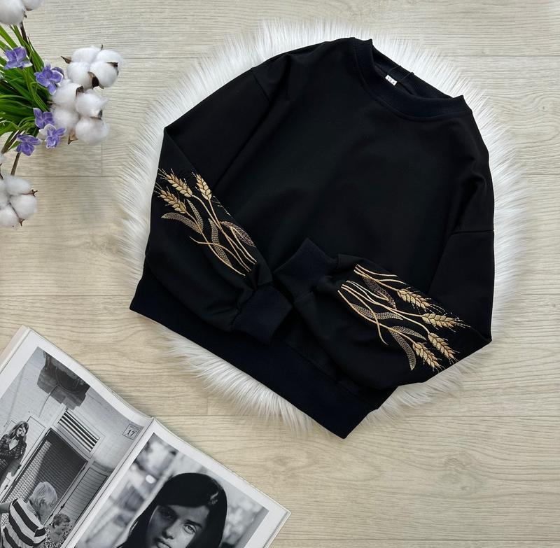 через кнопку купить только полная оплата!!! Стильный свитшот с вышитыми коласками 😍🌾🌾🌾😍 Свободный крой 🤩 Манжеты - рибана 👌🏻 ВИШИВКА🥰 Очень классное качество 👍🏻 Ткань: турецкая двунить 🔝 Производитель: Украина 🇺🇦 р.146-1шт ЗАМІРИ +/-1-2см!!! ▪р.146- длина от плеча 52см/ рукав от горловины 59см/ ПОГ 46см