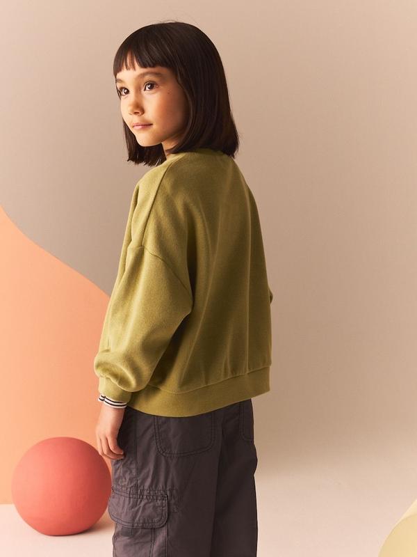 Насичений глибокий зелений травʼяний світшот оверсайз з ребристою горловиною, манжетами на рукавах та подолом від NEXT на дівчинку 9 років, 134 см. Склад: 90% бавовна, 10% перероблений поліестер У новому стані Колекція 2024-2025 рр З діючого каталогу.