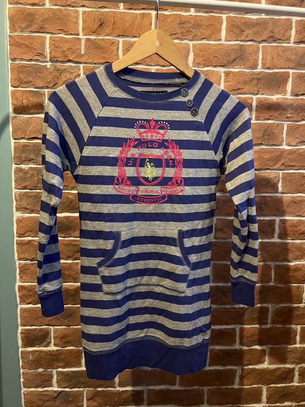 Зручна і стильна сукня-світшот бренду U.S. Polo Assn. Синьо-сірі смужки, фірмовий принт із гербом та написом Authentic U.S. Polo, попереду кишеня-«кенгуру», декоративні ґудзики на плечі. М’який трикотаж, приємний до тіла. Ідеальний варіант на осінь чи весну. Стан ідеальний 💙 Розмір: 8–10 років Матеріал: бавовна з домішками еластану (трикотаж) Сезон: демісезон (осінь/весна)
