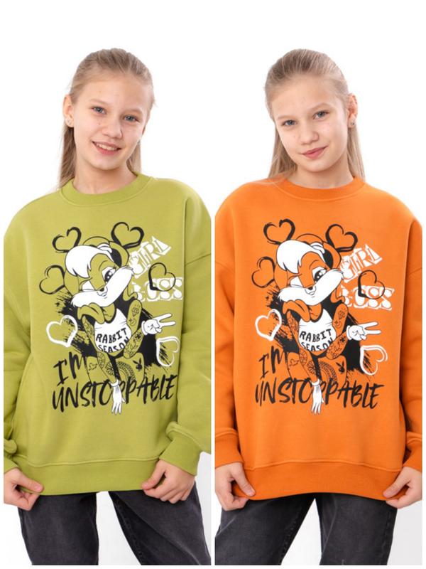 Теплый свитшот для девушек подростков на флисе со стильным накатом, оверсайз трехнитка, тё...