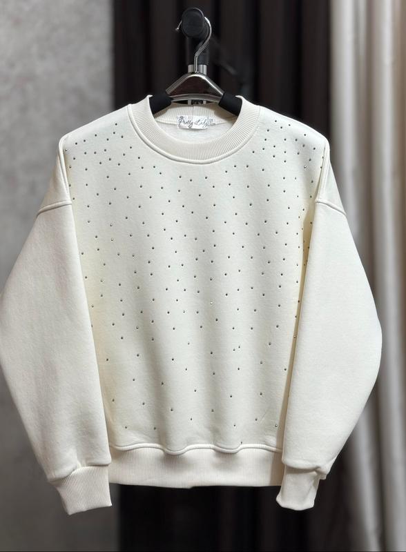 через кнопку купить только полная оплата!!! Нарядный свитшот с модными стразами Ткань: турецкая трехнить с начесом. Красиво переливается. Цвет - молочный. Замеры: 146 длина - 51см, полуобхват груди - 54см, рукав от горловины - 61см. 152 длина - 52см, полуобхват груди - 56см, рукав от горловины - 65см. 158 длина - 54см, полуобхват груди - 58см, рукав от горловины - 68см. 164 длина - 56см, полуобхват груди - 60см, рукав от горловины - 71см. Мс