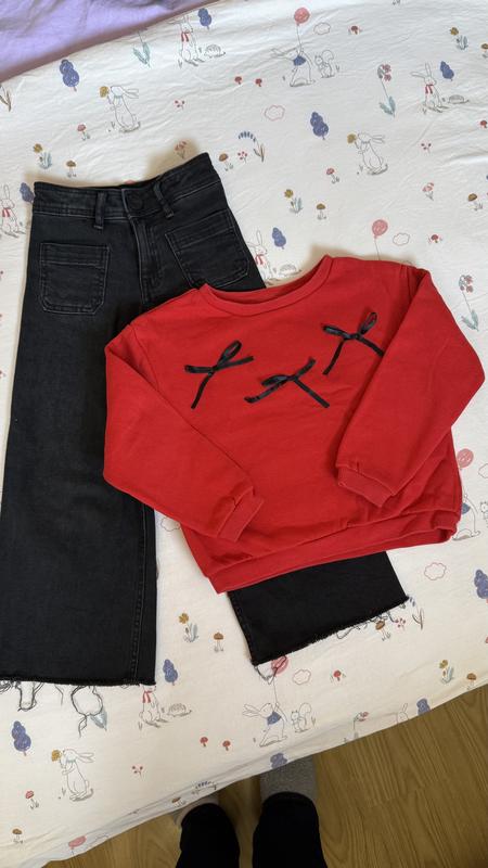 Утеплена кофтина червоного кольору з трендовими чорними бантиками. Чудово пасує до чорних джинс. Святковий образ.