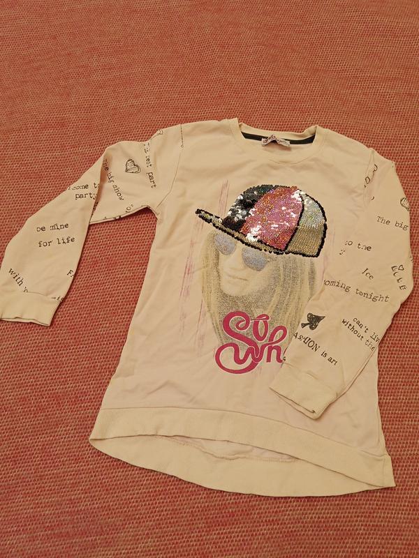 Свитшот для девочки с пайетками. Состояние хорошее, из нюансов желтые пятна. Выводить не пробовали. Замеры: Длина переда 49 см Длина спинки 55 см Полуобхват под рукавами 35 см Длина рукава 45 см