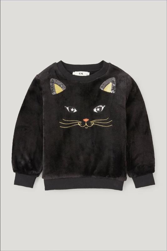 ⚡ ИНФОРМАЦИЯ ДЛЯ ПОКУПЦА 🔐 Безопасное оформление возможно с оплатой на карточку ПРОДАВЦА 📌 Уточняйте наличие перед заказом ⛔ Rozetka — тимчасово не надсилаю Свитшот из мягкого велюра с вышитой мордочкой кота, отделкой пайетками и ребристыми манжетами. Размер-116 (маломерит, лучше брать на 110) ПОГ-36, рукав от шва-39, от горловины-44, длина-44 Цена-640 грн