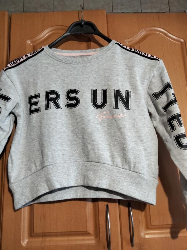 Свитшот для девочки из натуральной ткани, размер 140,на возраст 9-10 лет в красивом состоянии.Свитер спереди укороченный,плечи спущенные.Замеры: длина рукава 42 см, длина свитера 40см, полуобхват груди 42,5см, ширина плеч 42,5 см.