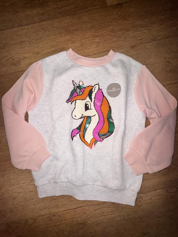 Світшот від H&M, модний принт із двосторонньої паєтки, всередині тонкий начіс. На вік 6-8 років, зріст 122/128 см. Довжина - 50 см., напівобхват грудей - 44 см., довжина рукава від горловини - 53 см.