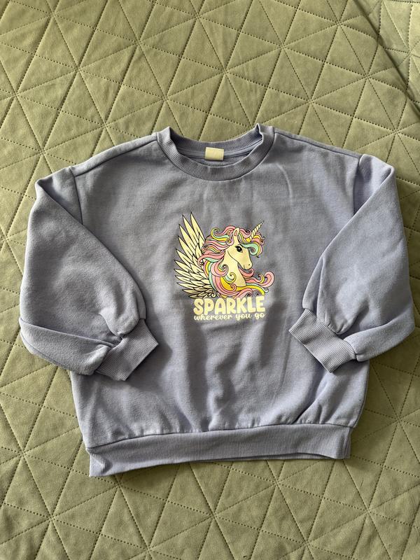 Фирменный свитшот для девочки с модным принтом-единорог, на начесике, спущенное плечо, фото с замерами есть.