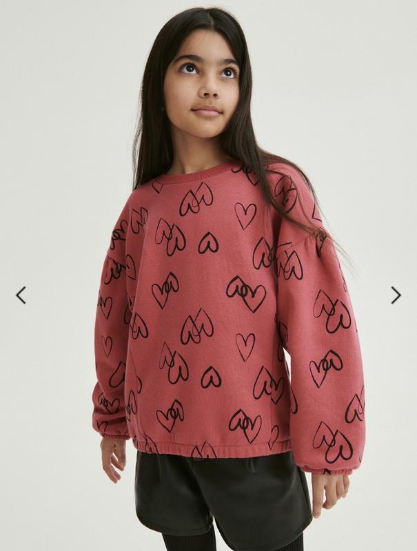 Світшот вільного крою, виготовлений з теплого трикотажу з бавовною. кругла горловина занижена лінія плечей вільні довгі рукави низ та манжети оформлені гумкою візерунок у вигляді серця з внутрішнього боку підкладка з м’яким ворсом
