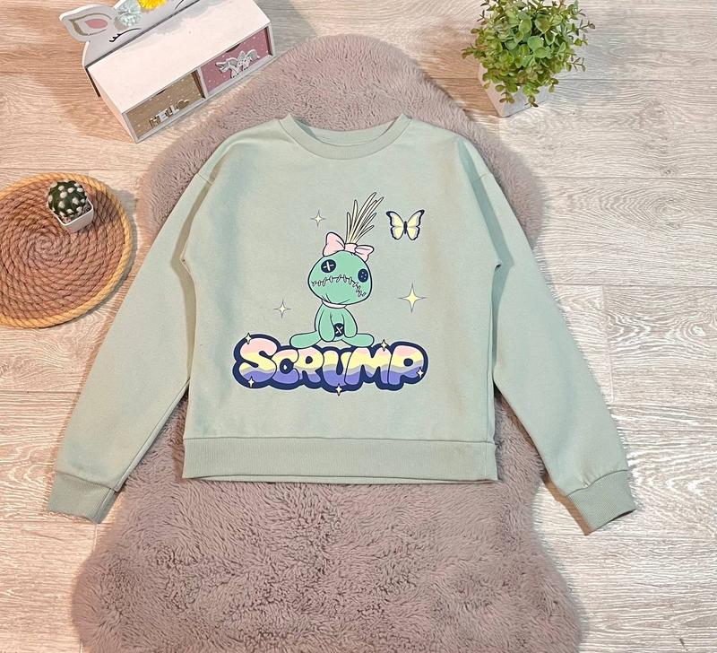 Классный свитшот состояния супер с изображением игрушки Скрумп из фильма Стич приятный мягкий коттон с начесом флис цвет оливка размер пишет 10-11р дов 52 пог 42 рукав от горла 64