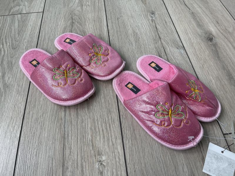 Тапочки , блестящие, красивые, легенькие. Есть незначительный минус. Имели много пластиковых соединителей, что держат пару. В некоторых местах остались места проколов этой леской. Незаметно. Уценила , цена 150грн Размер 32 - 19,5см стелька 33 - 20,5см