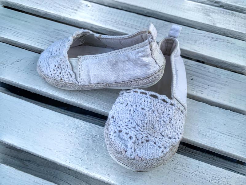 Отличные мокасины h&m для девочки. Цвет - белый. Легко и быстро одеваются. Материал: верх и подкладка - хлопковая ткань, спереди вставлена резинка, подошва резиновая, литая, со специальным антискользящим рифлением. Отличное качество!