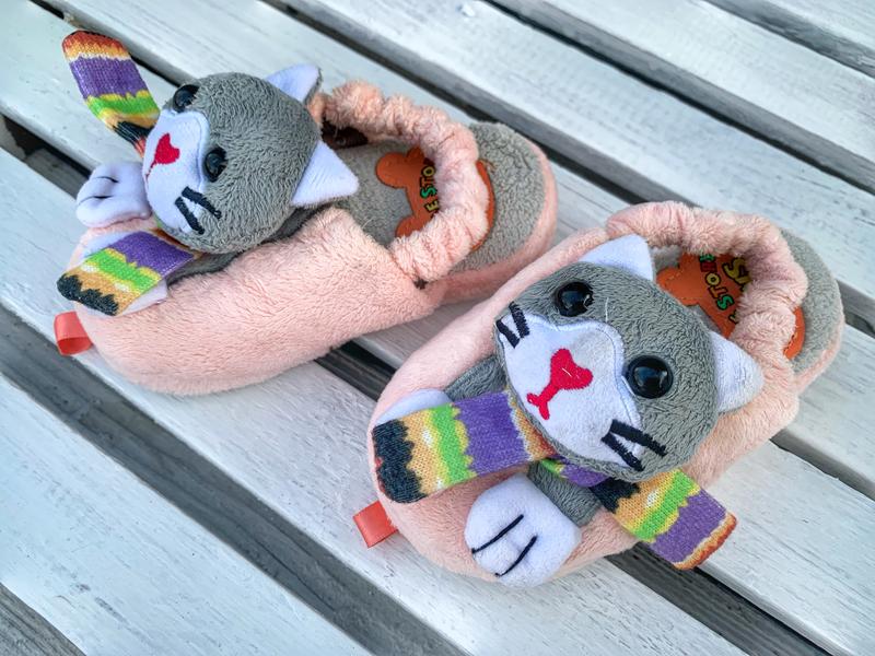 М'які, зручні, теплі пухнасті тапочки для дівчини, з нашивкою у вигляді мордочки котика, завдяки чому діти із задоволенням їх носять удома. Підошва – не ковзає. Розмір 23/24. Довжина устілки 14 см.