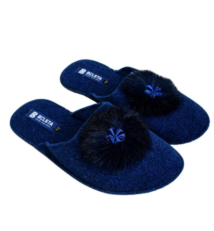 Закриті дитячі капці української фабрики БЕЛСТА, темно-синього кольору в палітрі «Сапфір» з додатковим елементом із хутра що робить дану модель сучасною Капці «Сапфір» представлені у розмірній сітці з 30 до 35 розмір