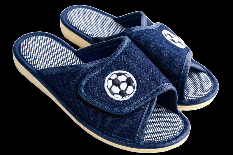 Відкриті домашні капці української фабрики БЕЛСТА, для хлопчиків. Виготовлені з якісної тканини-денім (джинс). Зверху є липучка. Також на капцях міститься вишивка у вигляді футбольного м'яча Розмірна сітка від 30 до 35 розміру Підошва- якісний матеріал поліуретан
