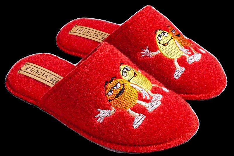 Детские закрытые войлочные тапочки украинской фабрики БЕЛСТА, алого цвета с вышивкой героев-смаколиков M&M's Тапочки покупаются в комплекте с годовым запасом конфет M&M's (шутка) Универсальная модель для мальчиков и девочек Размерная сетка от 30 до 35 размера
