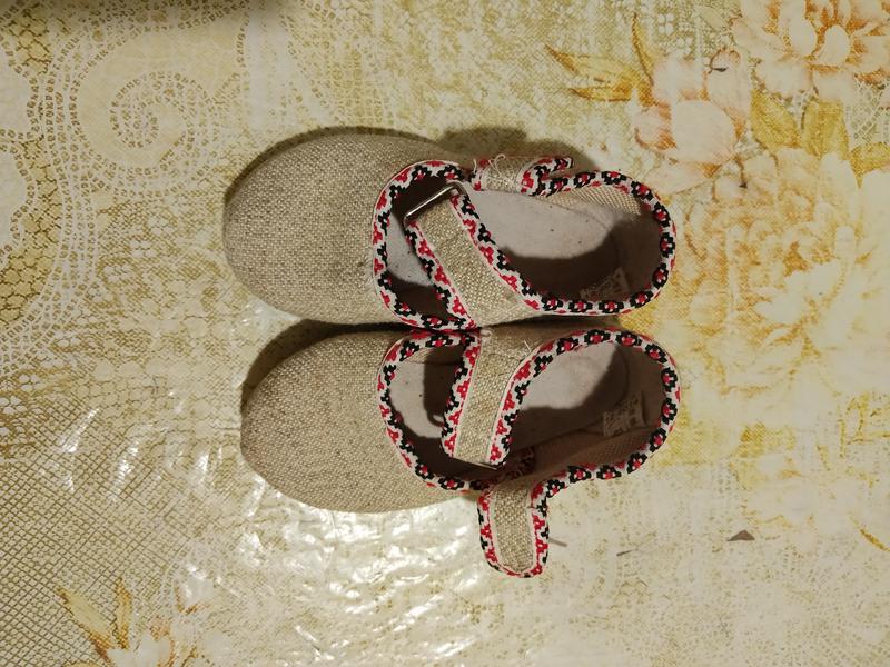 Продаются тапочки для девочки.Ткань лен.Колир беж.Выполненные в Гуцульском арнамете.Подходят для детских тренировок.Стелька 15 см.